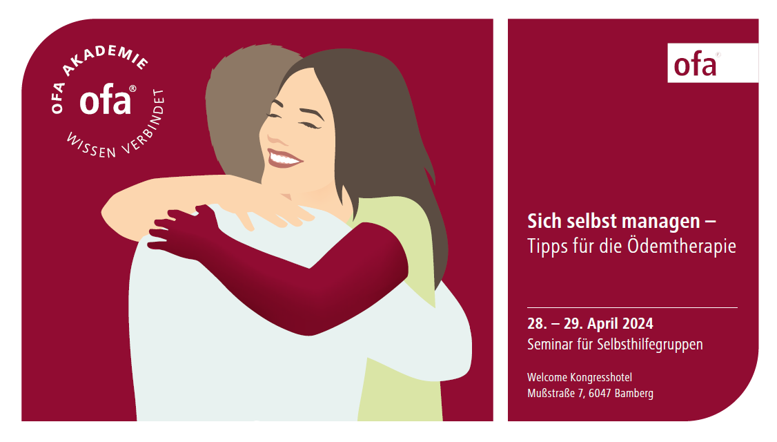 Vom 28. – 29. April 2024 ist es wieder so weit: Ofa präsentiert die nächste Ausgabe des Selbsthilfegruppen-Seminars mit dem Thema "Sich selbst managen – Tipps für die Ödemtherapie".