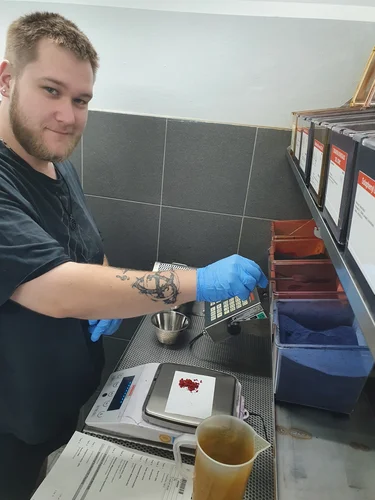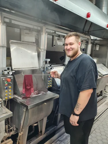 Nachdem er bei der Ofa Bamberg GmbH drei Tage lang zur Probe gearbeitet hatte, fiel seine Entscheidung auf die Ausbildung zum Produktveredler Textil beim Hilfsmittelhersteller. Sein Arbeitsplatz ist die Färberei. Hier werden medizinische Kompressionsstrümpfe – gestrickt in rohweiß – in verschiedene Farbtöne eingefärbt. Am Beruf des Produktveredlers fasziniert ihn besonders die Faserlehre, also wie die Fasern mit den verschiedenen Farbstoffen und Zusätzen reagieren.