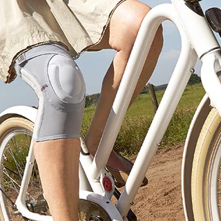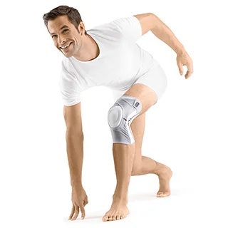 Die neue Kniebandage von Push care für gezielte Patellaführung unterstützt die Kniescheibe mit einer hufeisenförmigen Pelotte medial und lateral.