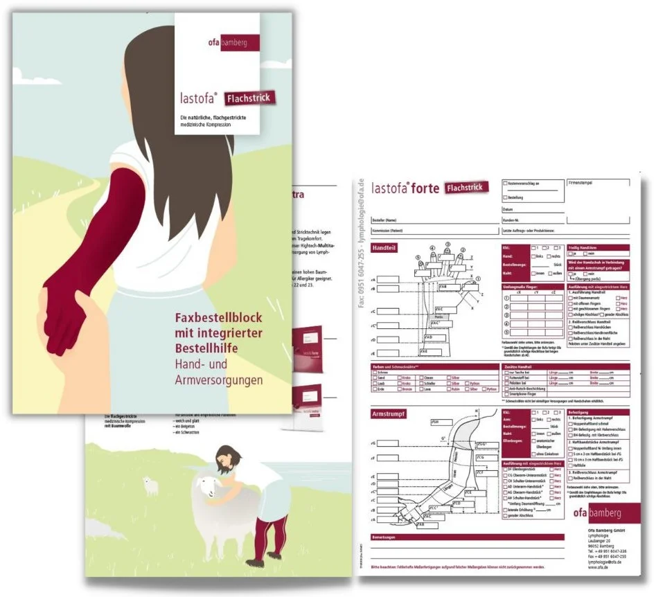 Das Anmessen von lymphologischen Kompressionsversorgungen setzt Grundkenntnisse in der Anatomie sowie Fachwissen in Sachen Materialien, Ausführungen und Zusätze voraus. Es ist wichtig, das Angebot und die Besonderheiten des Herstellers zu kennen, um so eine passgenaue Versorgung anzufertigen. Deshalb listet der Faxbestellblock von Ofa Bamberg das gesamte Flachstrick-Sortiment und dessen Auswahlmöglichkeiten für Arme und Hände auf. Was sich hinter den einzelnen Ausführungen, Farben, Haftbändern und Zusätzen verbirgt, erklärt nun die neue Bestellhilfe, die direkt am Faxbestellblock befestigt ist. Damit wird sie zu einem umfangreichen Nachschlagewerk, das bei Fragen im Messvorgang direkt zu Rate gezogen werden kann.