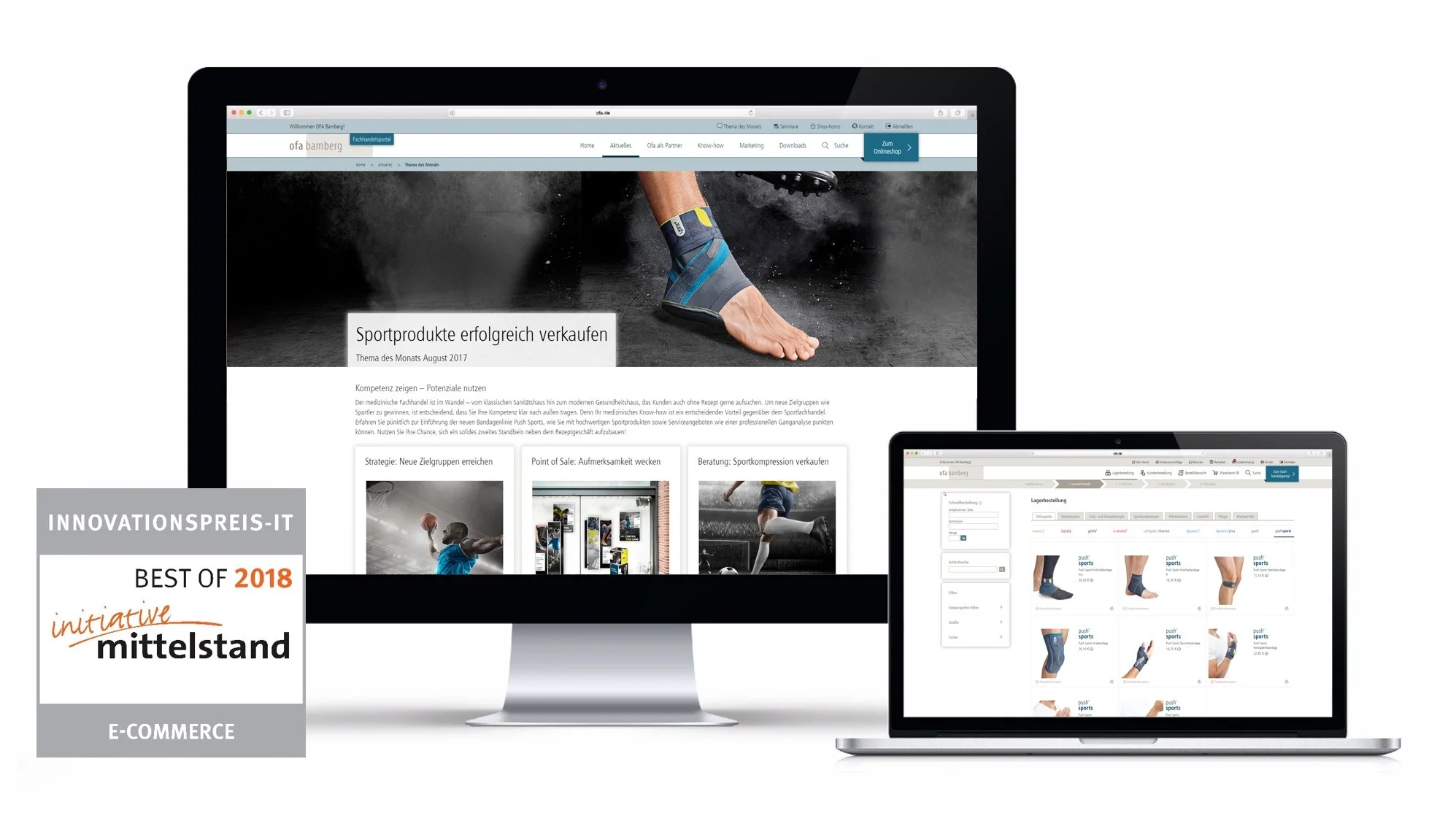 Nach 2017 konnte sich der Hilfsmittelhersteller in der Kategorie E-Commerce erneut auf der Bestenliste platzieren. Denn seither wurde der Ofa Onlineshop ofa24.de kontinuierlich weiterentwickelt. Immer mit dem Ziel, den medizinischen Fachhandel in seiner täglichen Arbeit optimal zu unterstützen. Ob Schnellbestellung mittels EAN-Code oder elektronische Patientenkartei – die einfache Bedienung stand bei der Entwicklung im Vordergrund, damit im Sanitätshaus mehr Zeit für die Beratung bleibt.