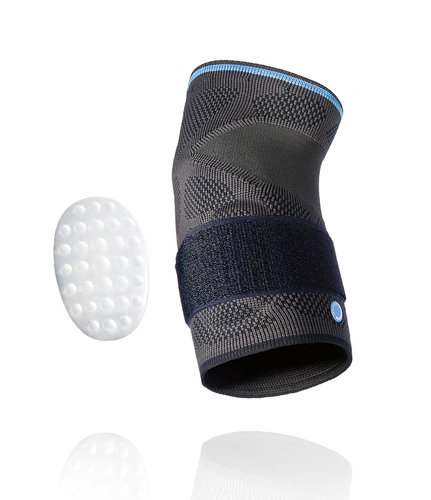 Die formschlüssig in die Bandage eingearbeiteten Silikonpelotten sorgen für punktgenaue Entlastung der Sehnenursprünge am Ellenbogen. Sie massieren bei jeder Bewegung die Gelenkregion und stimulieren zusätzlich durch ihre Noppenstruktur.