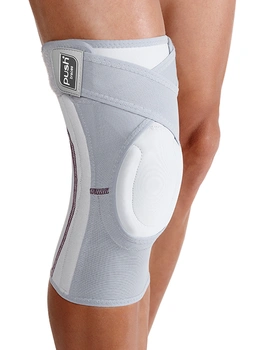 Die Push care Kniebandage lässt sich im oberen Bereich vollständig öffnen, um den Patienten einen leichten Einstieg zu ermöglichen. So kann sie auch bei eingeschränkter Beweglichkeit, etwa im Fall von Arthrose, mit geringem Kraftaufwand angelegt werden. Dank Silikonapplikationen auf der Innenseite sitzt sie anschließend sicher.