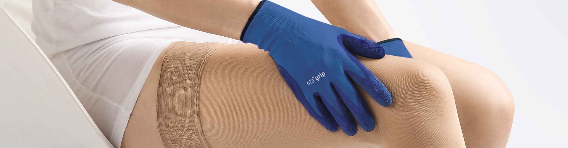 Das Tragen von Ofa Grip Spezialhandschuhen erleichtert das Anziehen und schützt den Strumpf vor Beschädigungen durch Fingernägel oder Schmuck. Die Handschuhe sorgen für einen optimalen Griff und verteilen den Strumpf gleichmäßig.